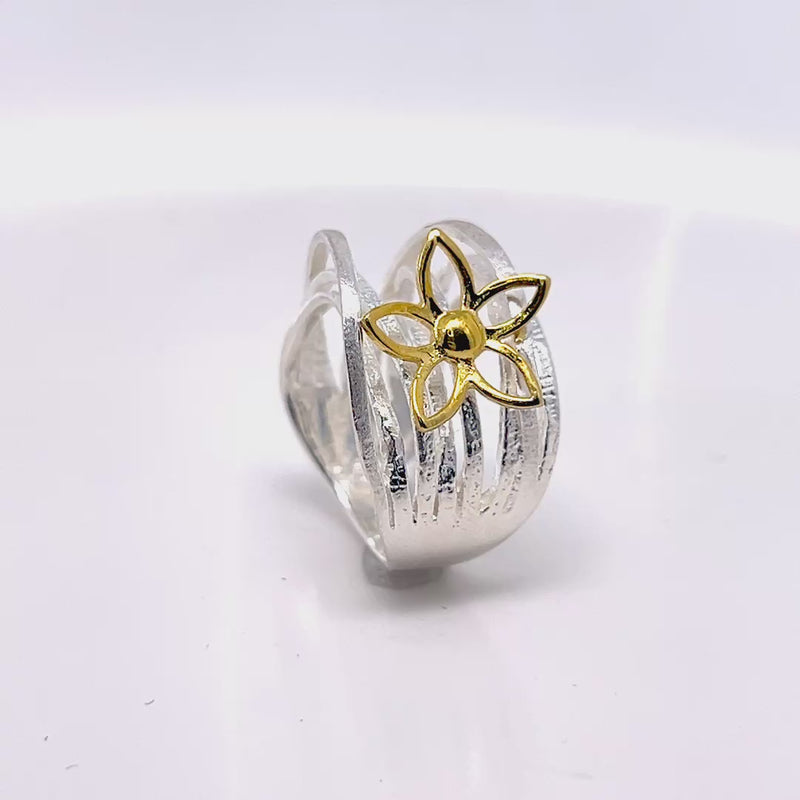 A handcrafted fusion of elegance and modern craftsmanship, this sterling silver ring features a delicate 18k gold-plated flower, offering timeless beauty for every season.