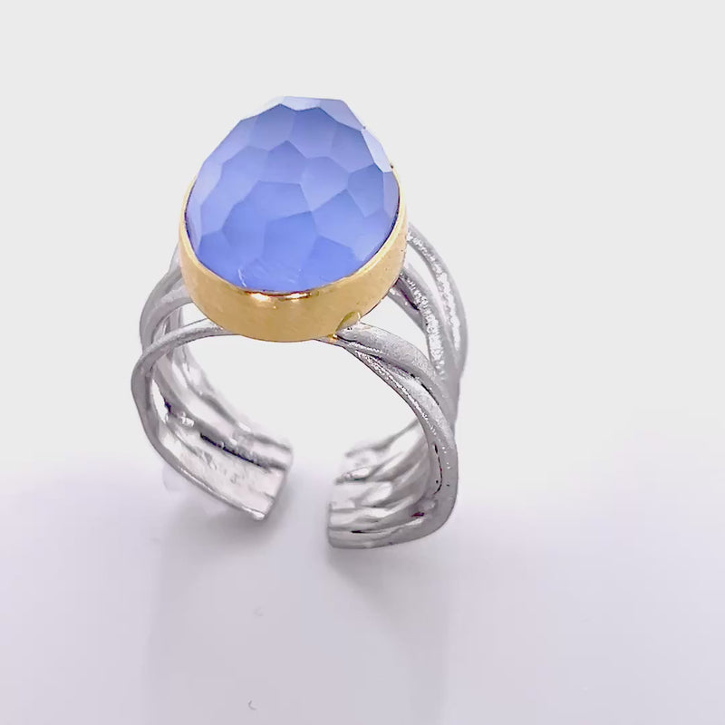 This sculptural ring combines fluid sterling silver with a faceted blue agate set in a warm gold-plated bezel. Designed as a statement piece, it balances color and form while remaining comfortable for everyday wear.