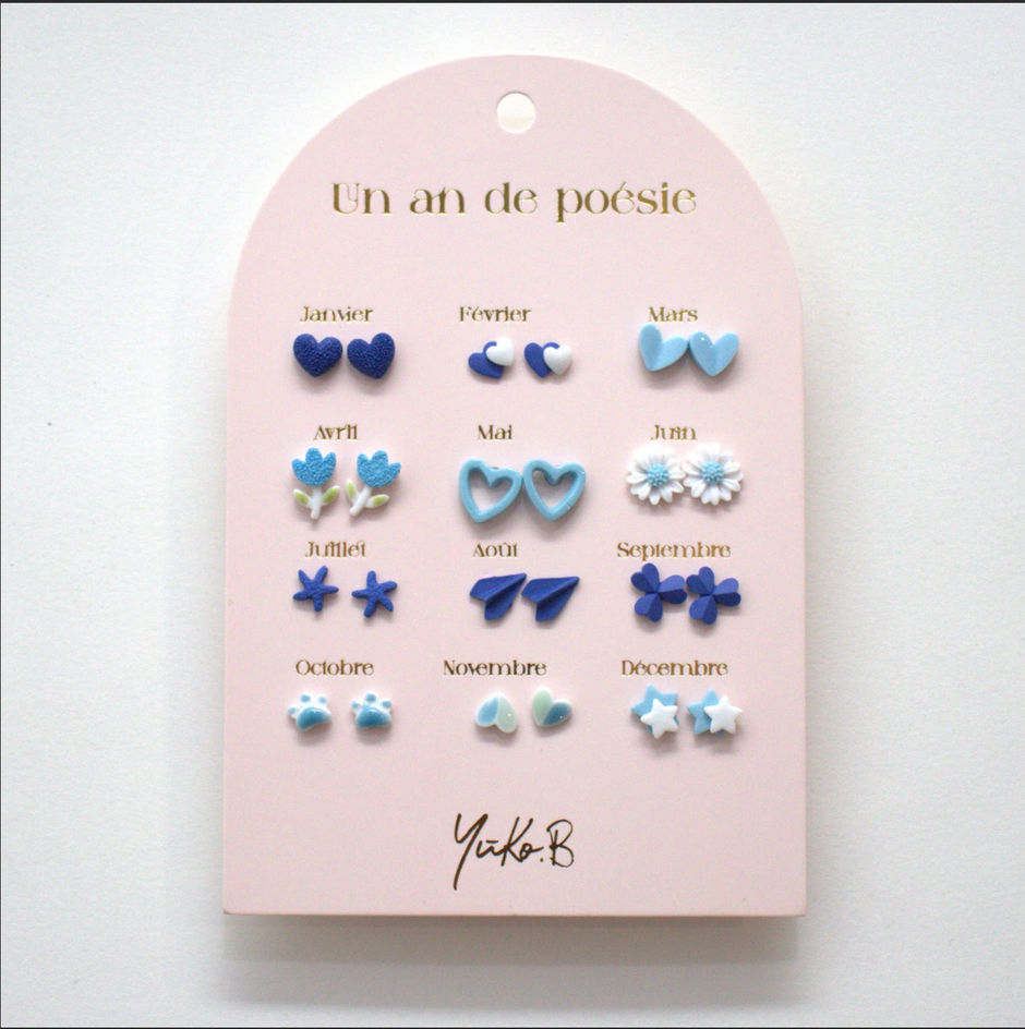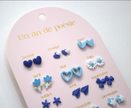 Inspired by the crystal-clear waters of the Cretan sea, the "Cerulean Dreams" collection brings a sense of calm and wonder to your child's jewelry collection. This set of twelve pairs features delicate blue ceramic motifs, offering a versatile range of styles from sky-blue clouds to deep indigo stars.