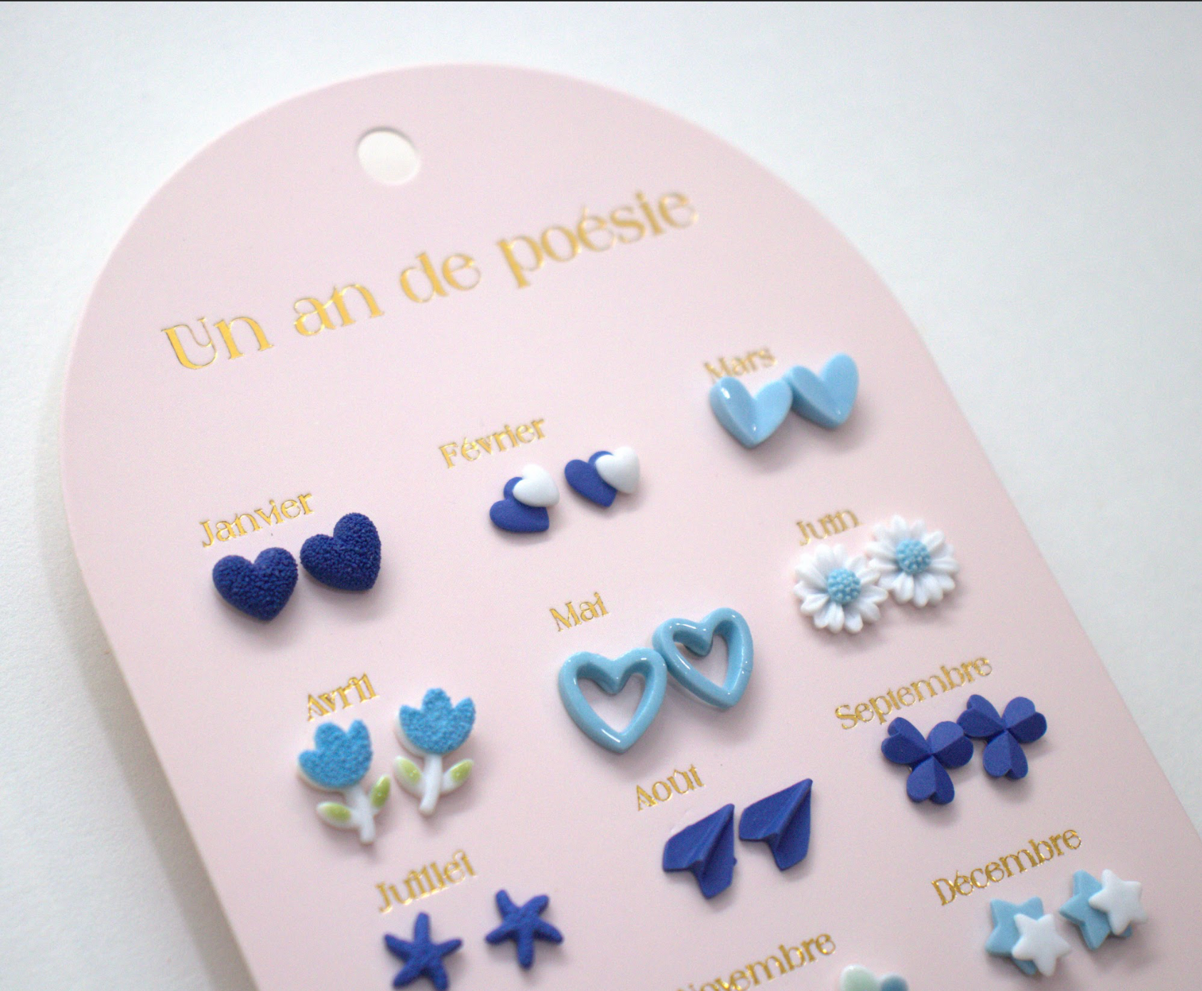 Celebrate every month with cool tones and sweet shapes in this 12-pair earring set. From hearts and stars to blossoms and butterflies, each design brings a new expression of childhood wonder in calming shades of blue.